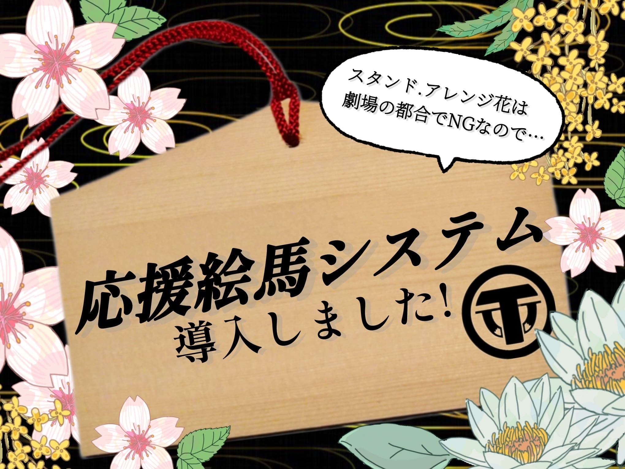 劇場の都合でスタンド花やアレンジメント花が贈れない代わりに、キャスト宛ての絵馬を劇場のロビーに飾らせていただきます。 25文字以内でメッセージを入れることができます! サイズ:横15cm/縦10cm /厚0.6cm ご購入の際に、 ①贈りたいキャストの名前 ②お客様のお名前(ペンネーム、匿名も可) ③キャストへのメッセージ【25文字以内】 をご記入ください。